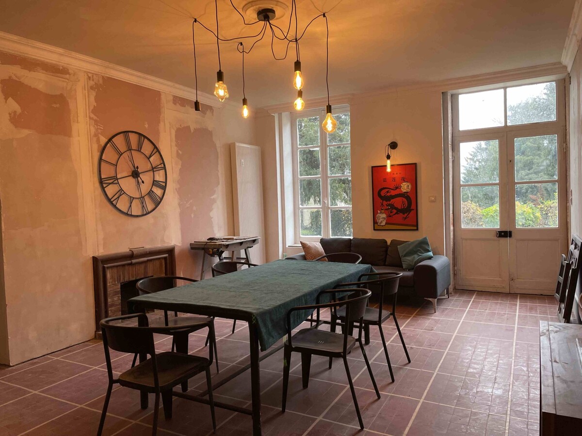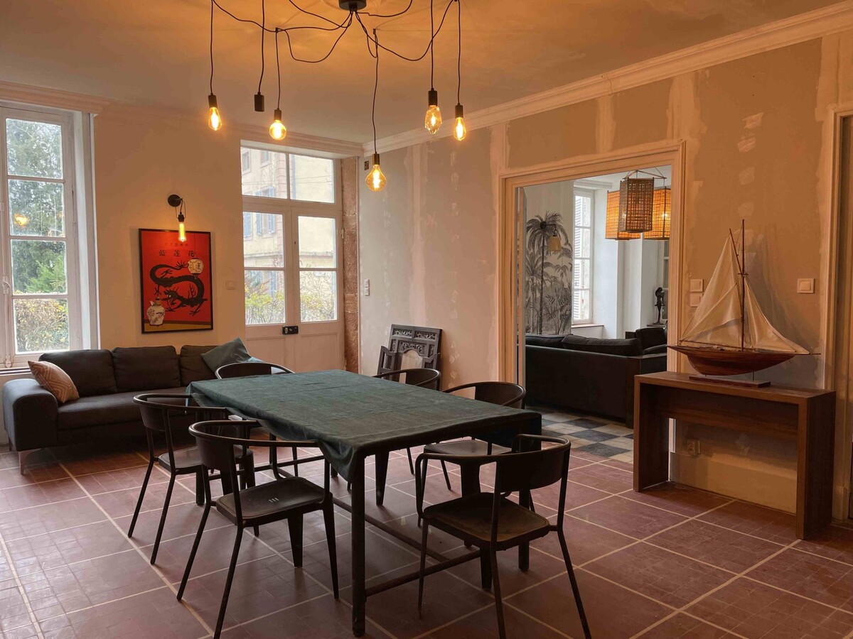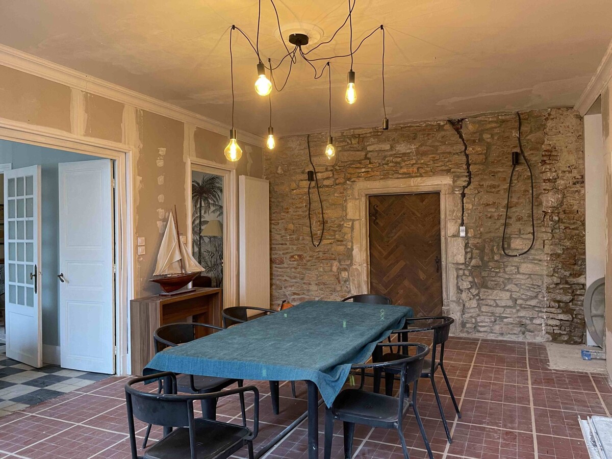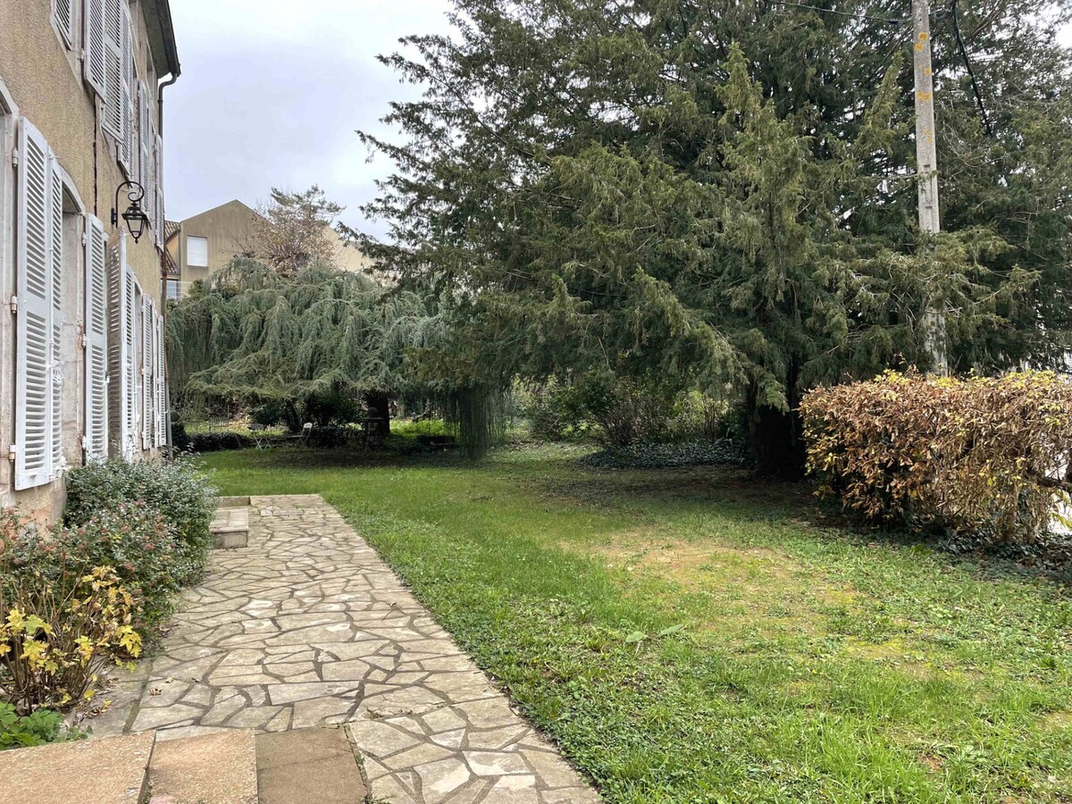 A VENDRE, CENTRE VILLE CUISERY, maison bourgeoise de 1850, récemment et partiellement rénovée, d'une surface habitable d'environ 255 m² sur 2 niveaux implantée sur un terrain de 850 m². Elle comprend au rez-de-chaussée : entrée, cuisine aménagée, salle à manger, salon double, suite parentale avec salle de bains et toilettes. Au premier étage, un couloir dessert quatre grandes chambres, une salle d'eau et des toilettes. Au-dessus un vaste grenier aménageable complète l'ensemble. Le logement est équipé d'un chauffage individuel au gaz de ville avec une chaudière récente (2023) et d'une isolation des pièces du rez-de-chaussée en laine de chanvre. Les huisseries sont en simple vitrage bois. L'assainissement est de type tout à l’égout. A ceci s’ajoute une cave. L’agréable jardin avec terrasse est arboré et clos. L'ensemble se situe au centre-ville de Cuisery, proche de toutes commodités.