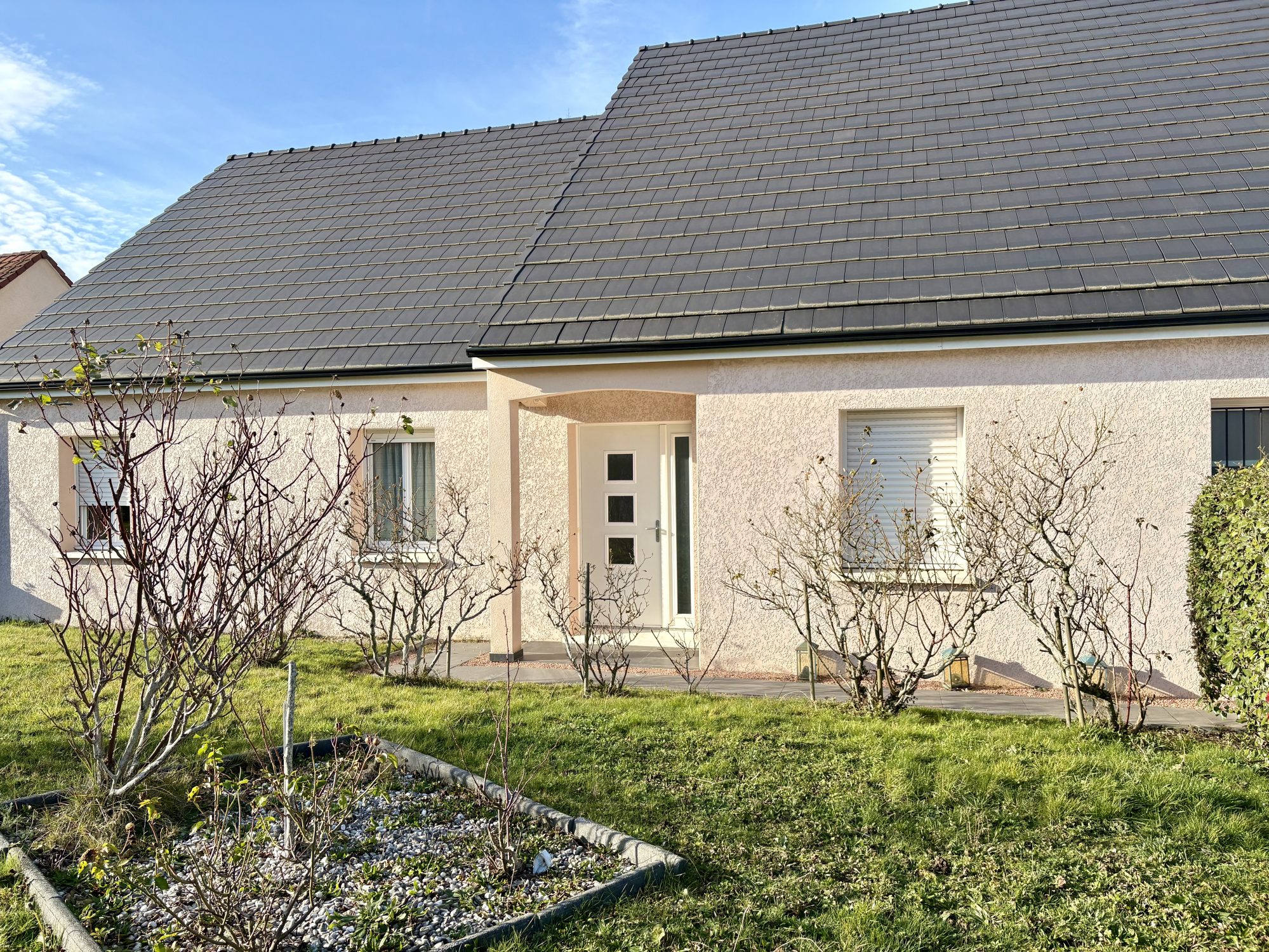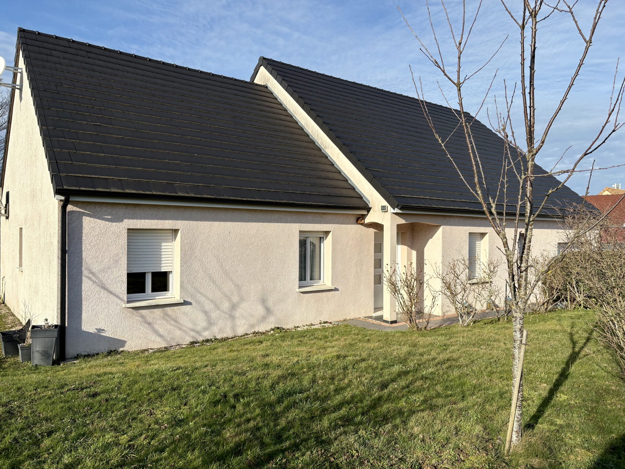 A VENDRE, VASTE VILLA DE PLAIN-PIED, belle construction traditionnelle de 2014 (RT 2012), 147 m² environ habitables sur un terrain arboré et clos de 870 m². L’habitation comprend une large entrée desservant la pièce de vie avec cuisine équipée ouverte (55 m²) donnant sur la terrasse exposée Ouest, buanderie/chaufferie avec adoucisseur, bureau/chambre avec accès à la terrasse et garage entièrement isolé. Un petit couloir dessert trois chambres, dont deux avec placards muraux, salle d'eau et toilettes séparées. Une quatrième chambre / suite parentale avec dressing aménagé, salle d’eau et toilettes complète l'ensemble. Le tout est en parfait état et très bien entretenu, les deux grandes baies apportent une belle luminosité, elles permettent de profiter de la vue dégagée et dominante. La terrasse de 40 m² est en partie couverte, elle est équipée d'un store banne électrique. Les huisseries sont en double vitrage PVC avec volets roulants automatisés, manuels dans les chambres. L'isolation est complète. Le logement dispose d'un chauffage au gaz de ville au sol (chaudière à condensation) complété par une pompe à chaleur air/air réversible dans la pièce à vivre. L’assainissement est relié au tout à l’égout. Il se situe dans un petit lotissement calme non loin des commodités de Tournus et Sennecey le Grand.