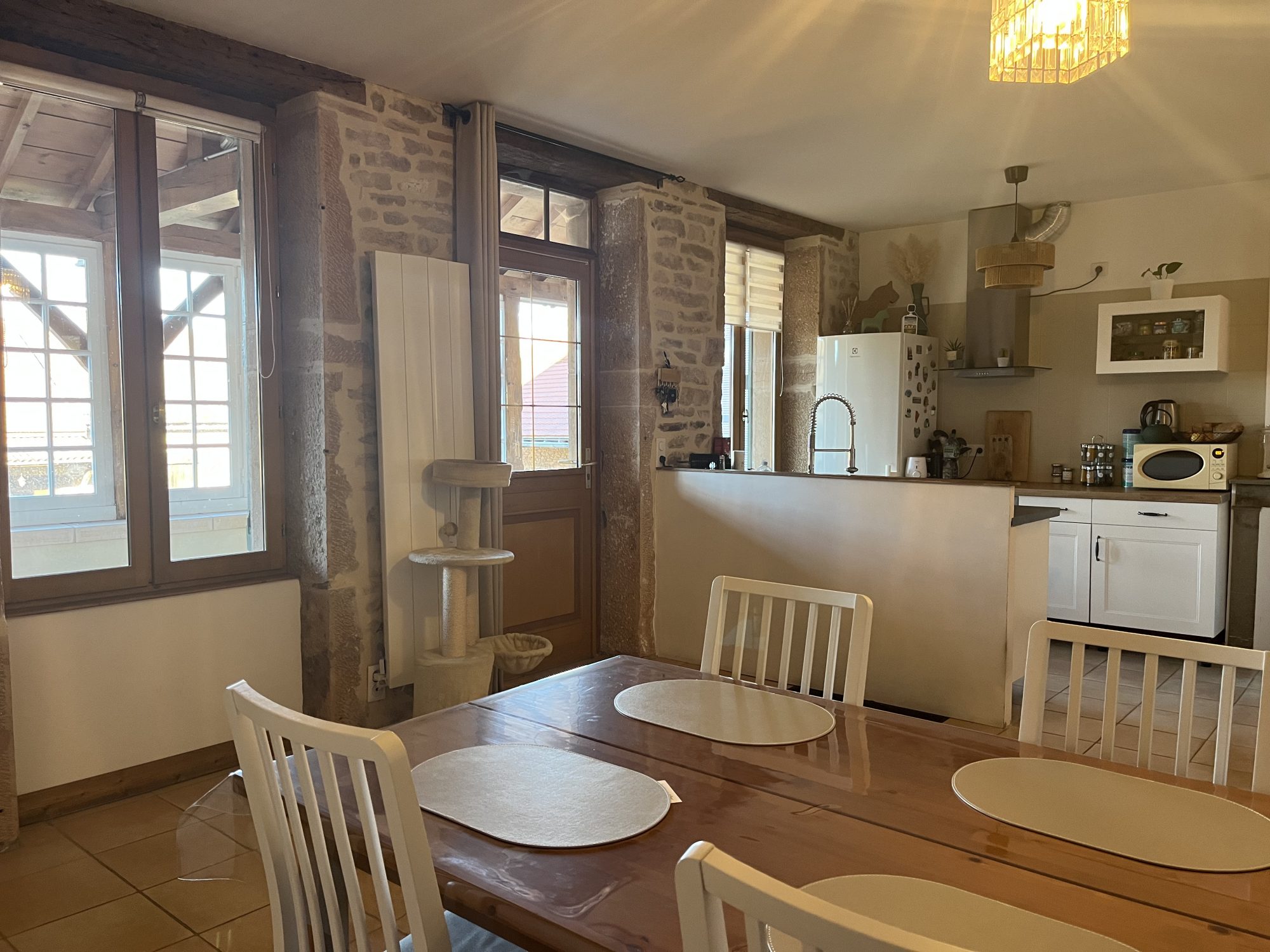 A VENDRE, VILLAGE DU TOURNUGEOIS, 15 mn TOURNUS OUEST, maison bourguignonne en pierre entièrement rénovée de 83 m² habitables, type 3 avec dépendances. Elle comprend au premier étage : une pièce de vie avec espace cuisine équipée et séjour donnant sur une agréable galerie couverte, salle d'eau et toilettes séparées. Au deuxième étage : dégagement desservant une grande chambre principale avec parquet en pin et une chambre enfant. Grenier partiellement aménageable au-dessus. Cave en terre battue et buanderie en dessous. La maison est équipée d'un poêle à granulés performant, de radiateurs électriques à inertie et d'un sèche serviette associés à une bonne isolation murs, combles, plancher et huisseries en double vitrage bois. La toiture est en bon état et la maison est reliée au tout à l'égout. A ceci s’ajoute une grange séparée en terre battue de 50 m² environ avec mezzanine au dessus. L’accès à la maison orientée Ouest se fait par une cour indivise gazonnée avec un petit espace privatif. Elle se situe au calme dans un hameau du village d'Etrigny.