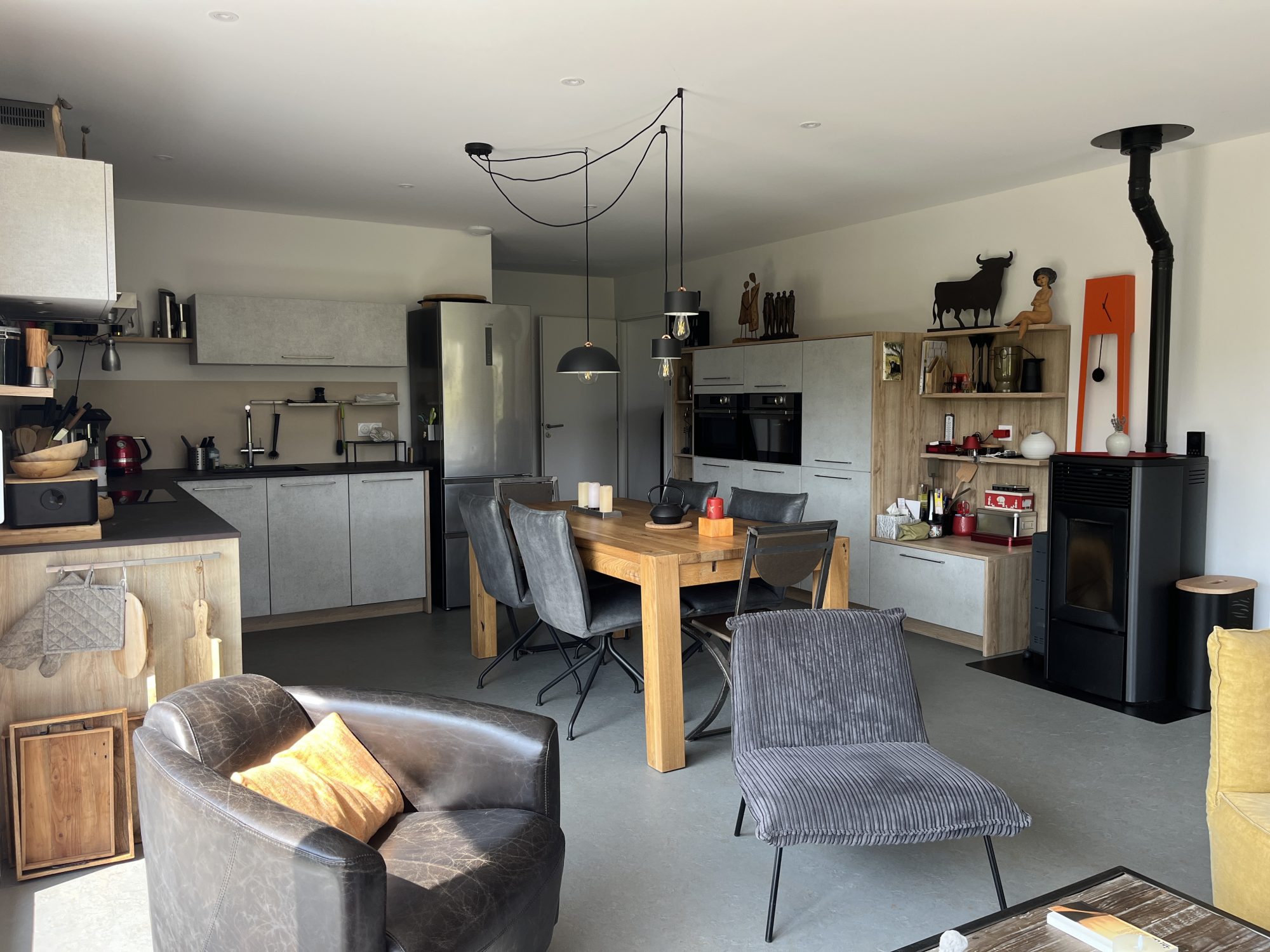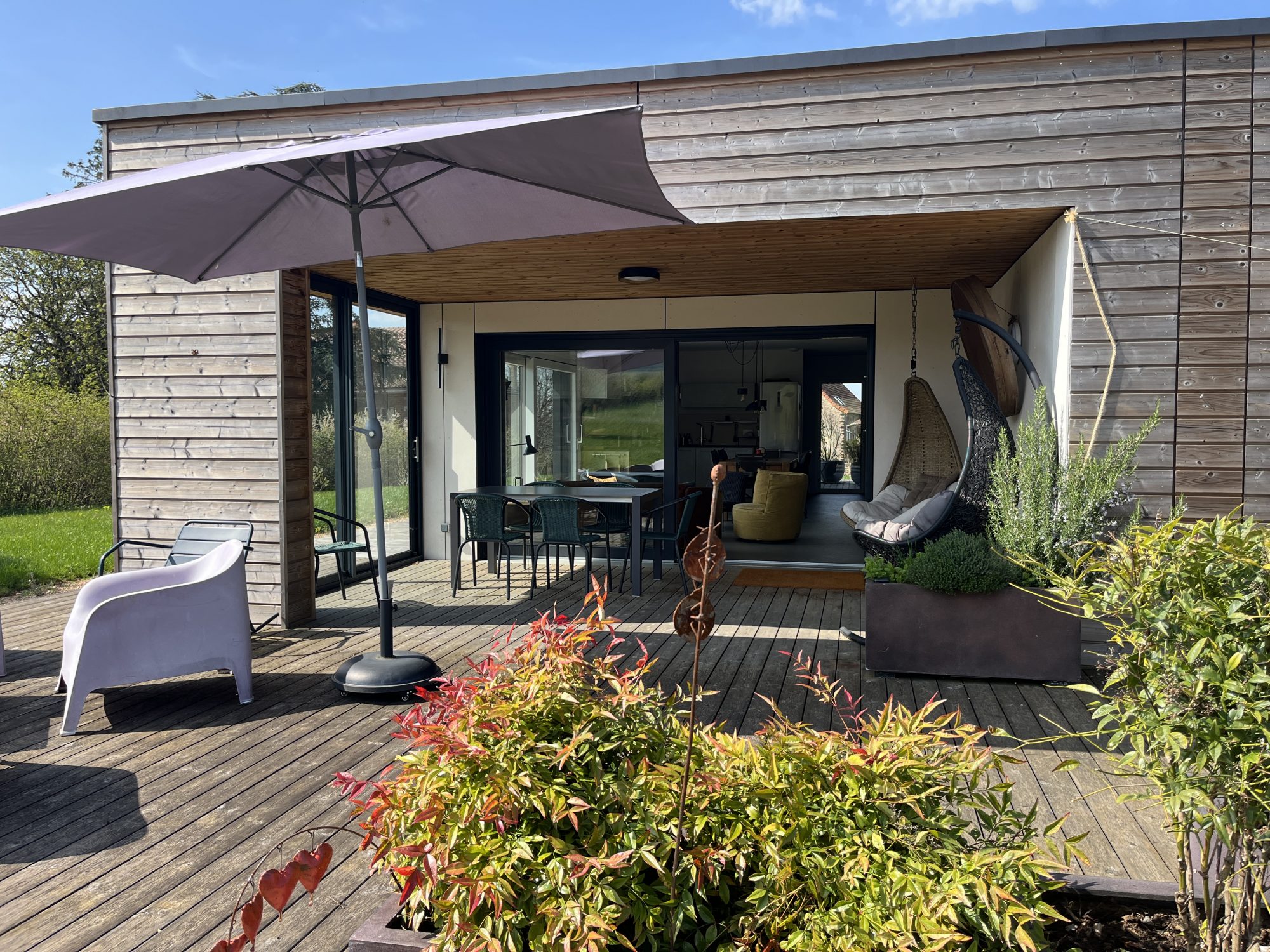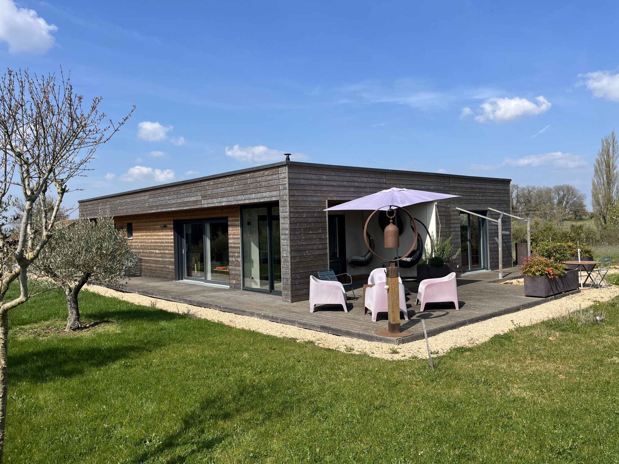 Dans un environnement calme et verdoyant, découvrez cette magnifique maison contemporaine, ossature bois BOOA avec toiture terrasse, alliant charme naturel, modernité et prestations de qualité. Construite sur vide sanitaire, l’habitation de plain-pied séduit dès l’extérieur par son architecture et ses lignes épurées. À l’intérieur, une entrée s’ouvre sur une spacieuse pièce de vie baignée de lumière grâce à de larges baies vitrées, offrant une ouverture directe sur la nature environnante. La cuisine, moderne et entièrement équipée, s’ouvre sur le salon séjour, créant un espace convivial et chaleureux. Petit cellier attenant. Côté nuit : trois chambres dont une ouvrant sur l’extérieur, une salle d’eau équipée / toilettes japonais et des toilettes séparées. Cette maison éco-responsable de 98 m² habitables dispose d’un poêle à pellets (8 kW), de radiateurs électriques en complément et d’une isolation thermique performante. Nombreux équipements : ballon thermodynamique, système de protection anticalcaire, cuve 10 000 L récupération eau avec pompe automatique, panneaux brise soleil alu, volets roulants intégrés dans l’ossature, cuisine haut de gamme. À l’extérieur, deux belles terrasses couvertes prolongent l’espace de vie avec une vue exceptionnelle et dégagée sur la campagne environnante. Implantée sur un terrain bien paysagé et arboré de 6746 m², cette maison de construction française offre un cadre de vie rare dans le respect de l’environnement, saine pour ses occupants et pour la planète. Un bien « coup de cœur ».